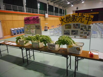 また、当日は3・4年生の子供たちが育てた野菜の販売も行いました。どのように販売すればよいか?値段はどうするか?こちらもすべて子供たちの手作りです。発表とともに力を入れ、楽しみにしながら準備を進めてきました。保護者、地域の方から好評をいただき、大満足でした。